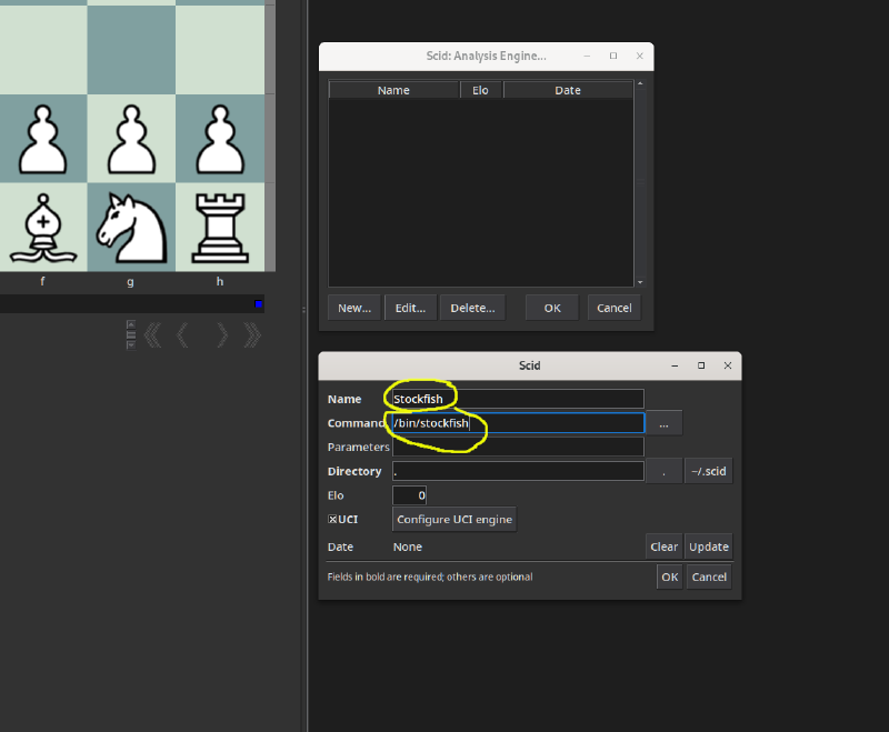 Go to Tools–>Configure Engines and click on the New button towards the bottom left of the window that pops up. Name the engine whatever you want. I’ll call mine “Stockfish”. Next, if you’re on Mac Or Linux, fill in the Command box with “/bin/stockfish”. If you’re on Windows add the path to the stockfish executable file that you downloaded and unzipped. This will look something like “C:\Users\<username>\Downloads\stockfish-windows-x86-64-avx2\stockfish\stockfish-windows-x86-64-avx2.exe”.