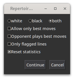 Go to Play–>Training–>Openings–> From the window that pops up select “white”, “black”, or “both” (whichever you chose in step 1.6. and click on continue.