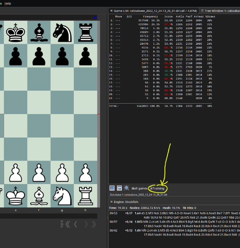 In addition to loading up an opening repertoire I always load up an engine and dock it on the bottom to maximize the real estate. I’ll use the tree window, engine window, and also start up SCID in training mode. I’ll just keep the engine running in the background while working through opening lines paying special attention to the tree window and the suggested engine moves. You want to look out for any discrepancies between the frequency/score in the tree window as compared to the evaluation of the engine’s suggested moves. The best moves are not always the most frequently played. Sometimes the engines suggested best moves are not even in the database.