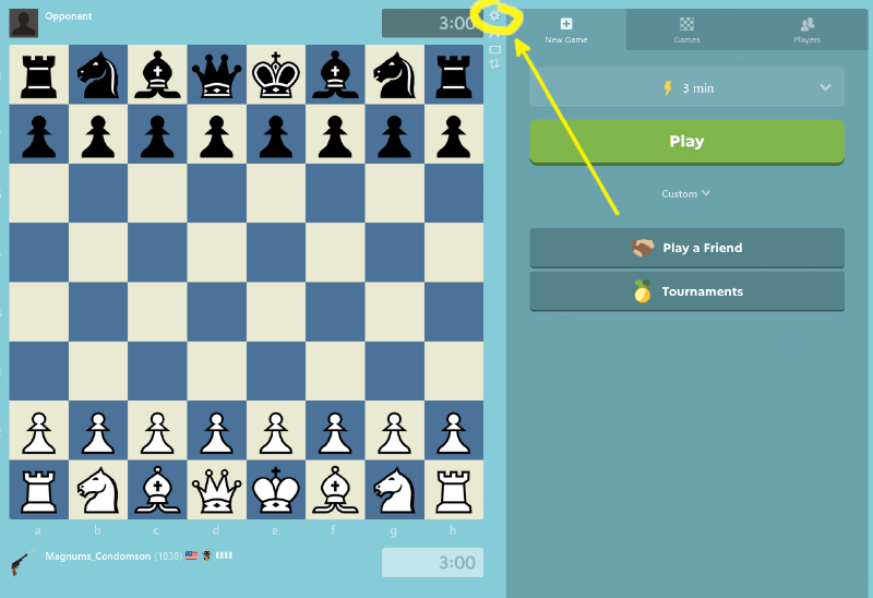 From here you want to click on the settings icon (the little gear) in the top righthand corner of the chess board.