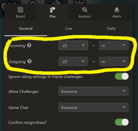 What’s the wise old saying? “If you’re the smartest person in the room, you’re in the wrong room.” Well essentially this little settings tweak gets you in the right room by limiting your opponents to only those that are a mere 25 elo points lower rated than you while on the other end you are potentially paired with the infamous DrDrunkenstein himself (however unlikely).